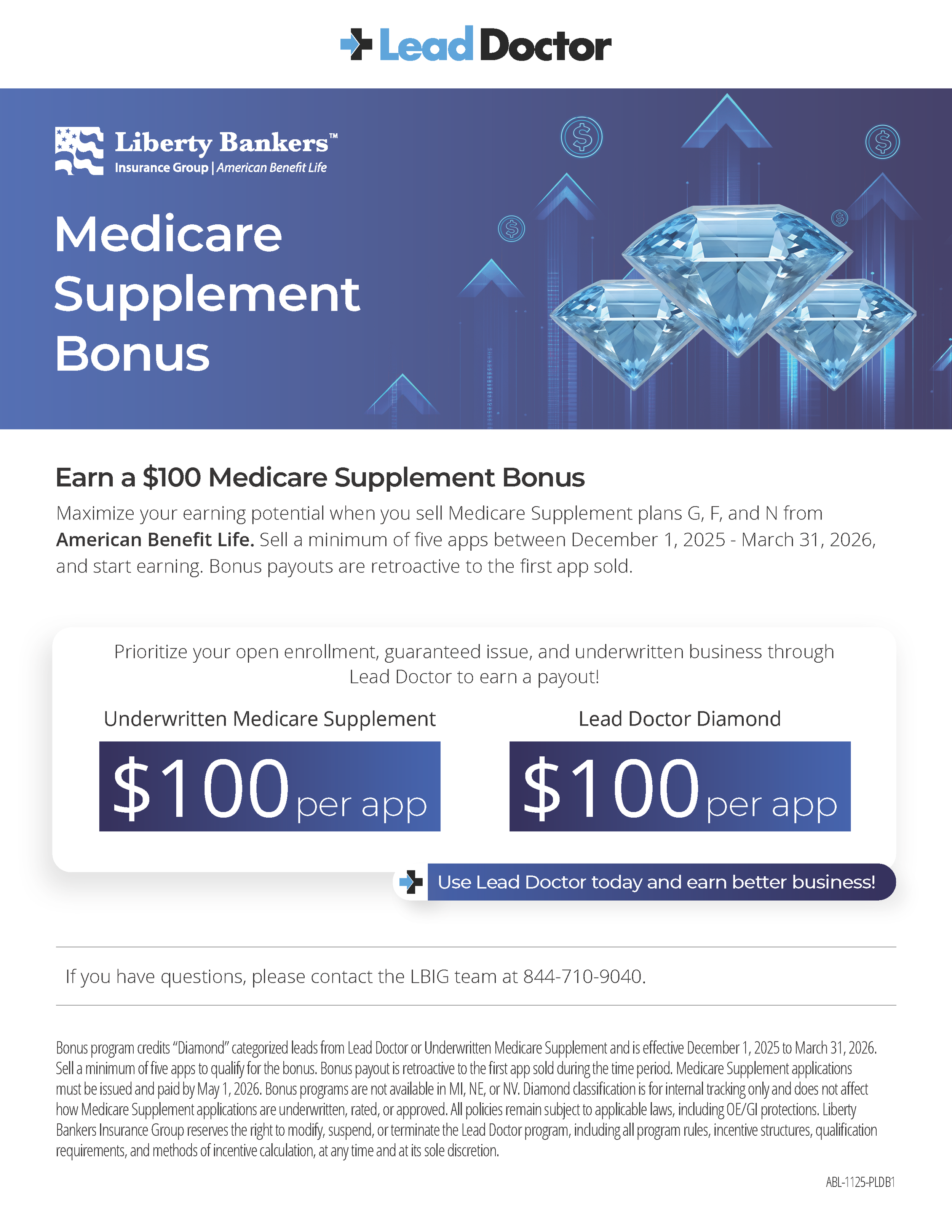 Under the guidelines of this exciting new incentive, traditional Underwritten policies will earn the agent a $100 bonus - not only that, but non-underwritten policies that are processed through ABL’s new Lead Doctor program will also count towards the agents Underwritten Mix and earn them a $100 bonus as well. 🤩