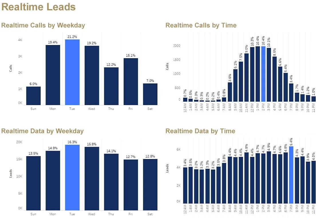 Which days of the week, and times of day, have the most Realtime call and data leads?